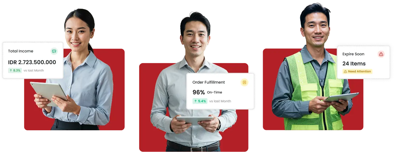 Dapatkan insight menyeluruh ke seluruh proses bisnis dalam satu layar untuk keputusan cepat dan kepuasan pelanggan.
