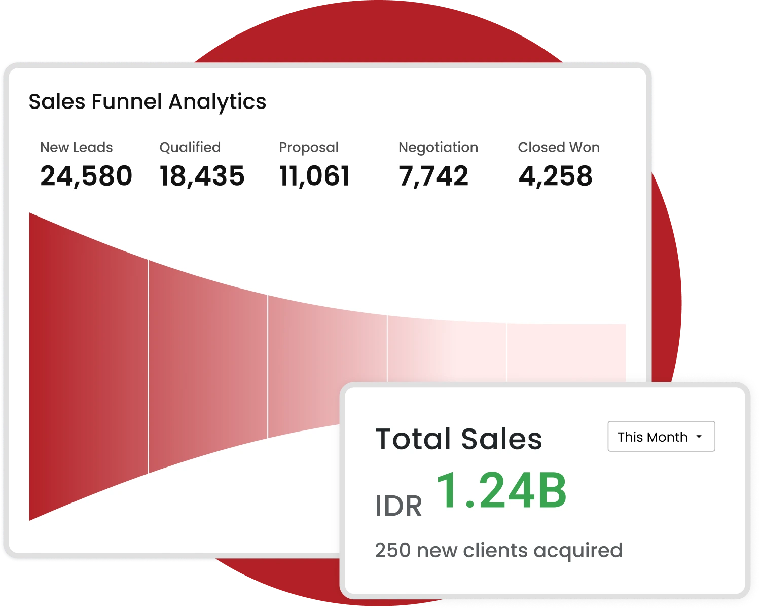 Semua prospek, transaksi, dan aktivitas tim sales tersentralisasi secara otomatis dalam satu sistem sehingga informasi selalu akurat.