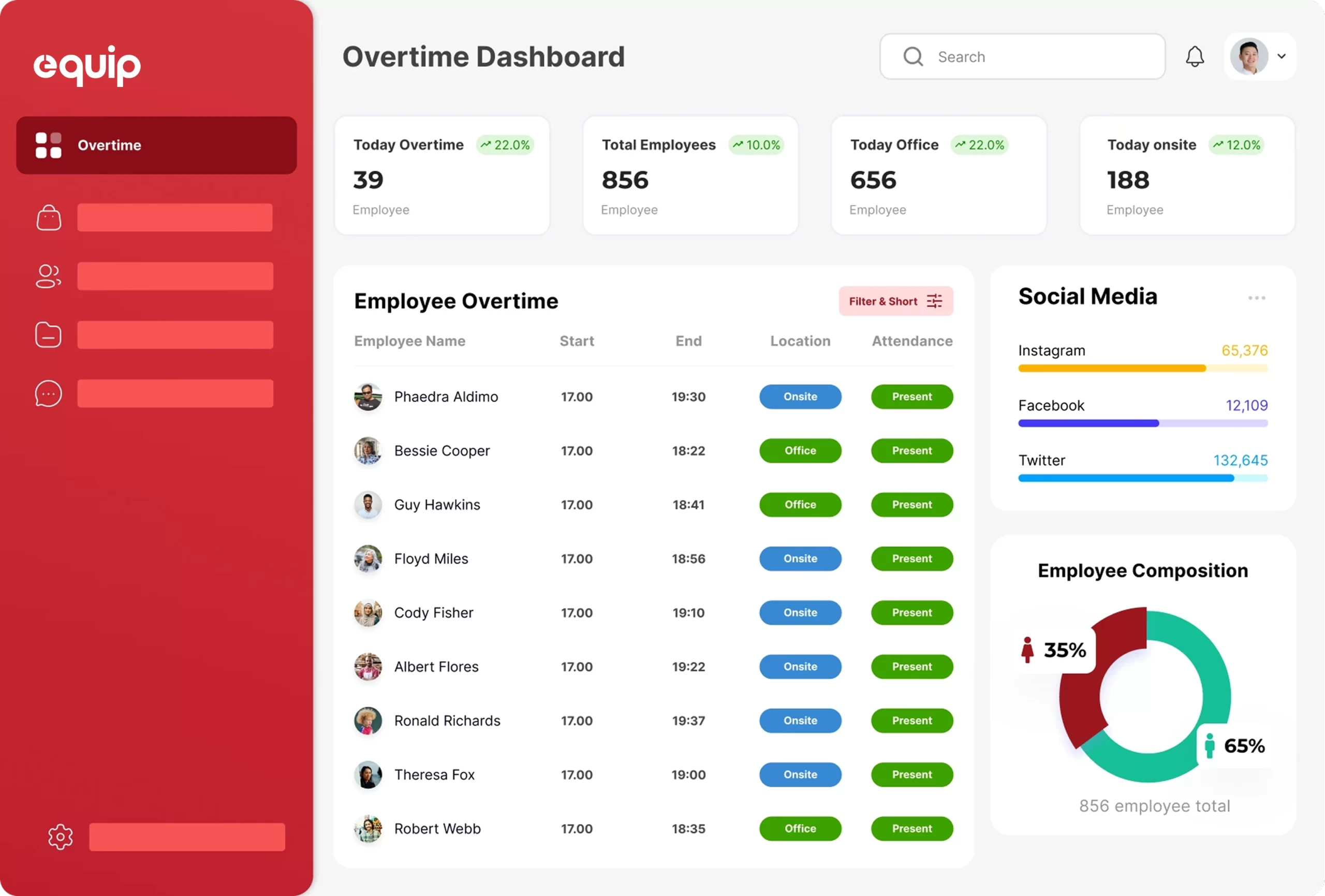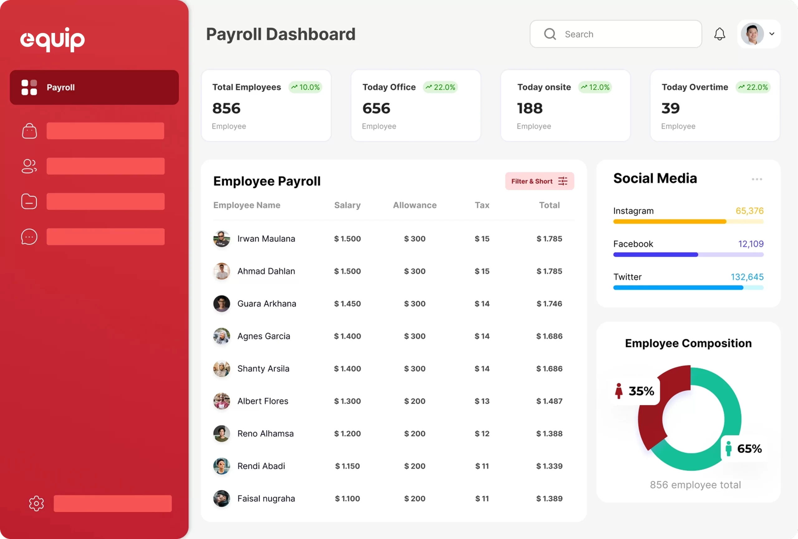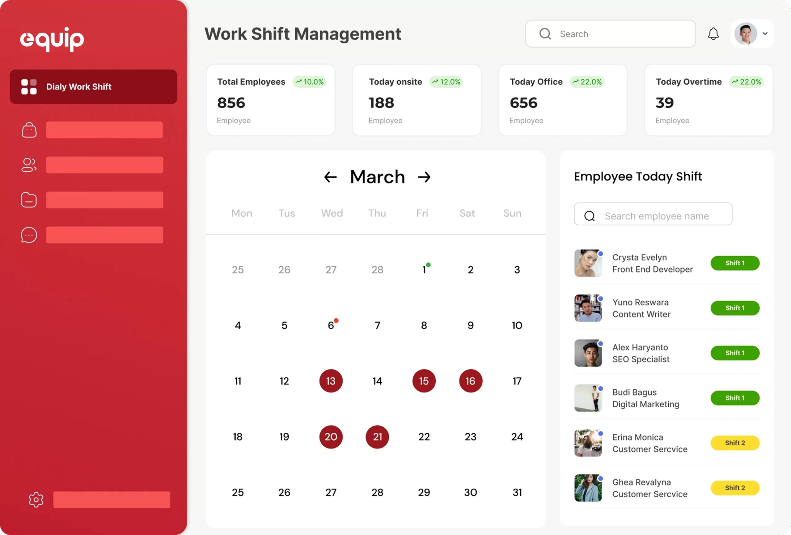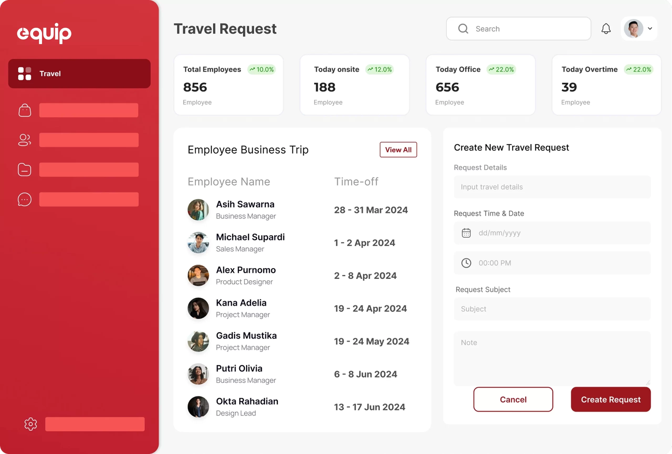 Hemat waktu dan tenaga dengan software HR Equip. Integrasikan seluruh aspek esensial manajemen HR, mulai dari penjadwalan shift, hingga perhitungan dan pembayaran payroll.